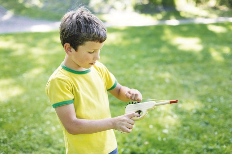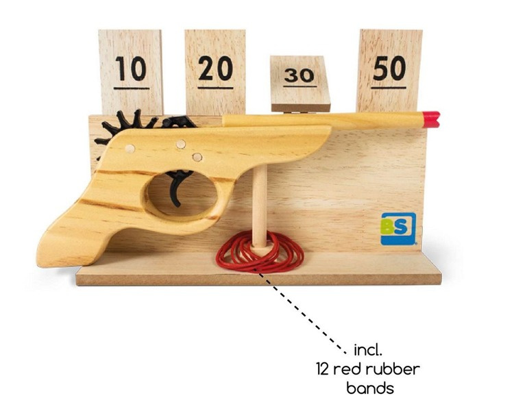 Do zestawu dołączone są gumki recepturki oraz pistolet z ruchomą zębatką, która po naciśnięciu spustu powoduje uwolnię się gumki i oddanie strzału do celu. Zręcznościowa rozrywka dla całej rodziny.