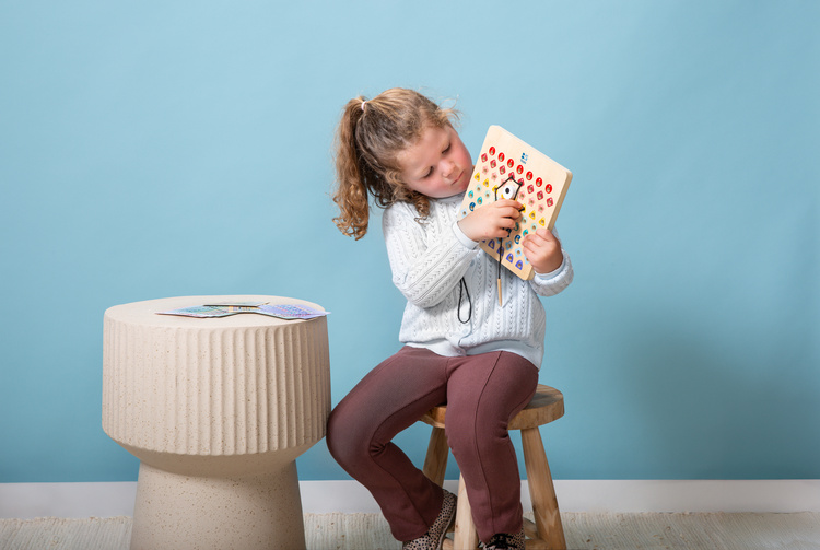 Przewlecz drewniany patyczek przez otwór, który odpowiada kolorowi, liczbie i wypełnieniu (pełne lub otwarte) wskazanemu na karcie.