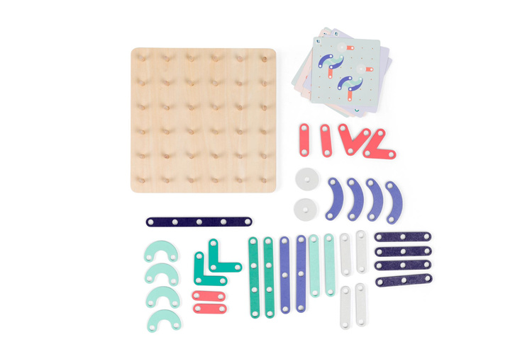 Drewniana tablica manipulacyjna z płytkami Geoplank jest znaną i lubianą grą przez dzieci i ich rodziców. Na dużej, drewnianej tablicy 20 x 20 cm umieszczono bolce w równych odstępach. Dzieci mogą korzystac z kart pracy albo tworzyć dowolnie. Młodsze dzieci, które jeszcze nie będą potrafiły odwzorować wzoru z karty pracy, mogą dowolnie układać wzory .